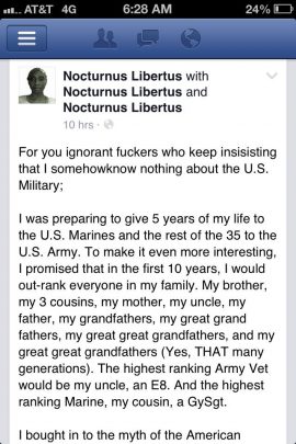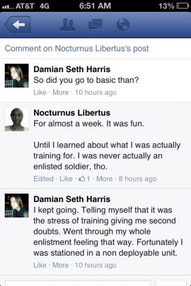 I find what Nocturnus Libertus aka Sierra McGrone claims is absolute BS. You don’t learn to shoot a gun in the first week of basic training and you certainly don’t train for war. You are broken down in the first week, you get your ass kicked mentally. You are later built back up so that you listen without question to authority which is exactly how you have to be in situations of combat, disciplined, that’s one definite thing they start teaching you in the first week.