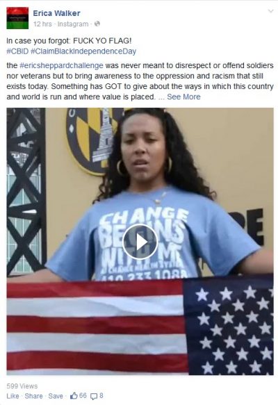 July 4th 2015:  Erica Walker decided to celebrate the 4th of July by stepping on an American flag.  A video has recently appeared on her facebook page showing the disgraceful act.  This time she mentions that veterans fought for that freedom but claims it’s “Not given to all”.