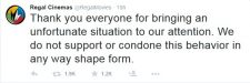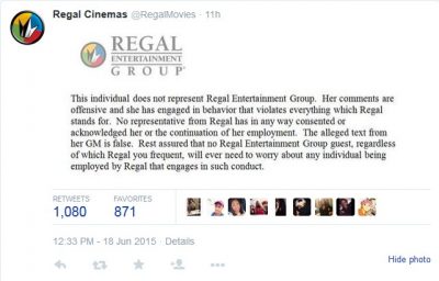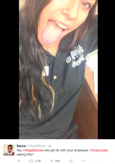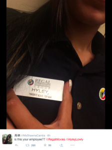 People took issue to this post and determined that Hyley worked at Regal Cinemas. After several people reported it, Regal Cinemas made two statements on their twitter page. They imply that Hyley would not be employed by Regal Cinemas, but don’t outright say that she was terminated.