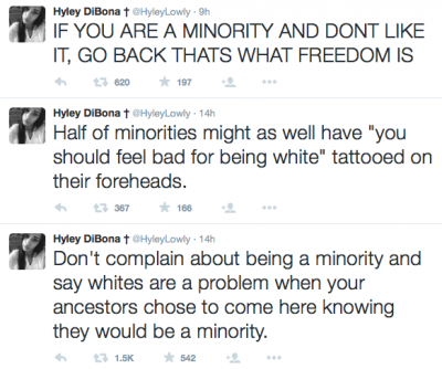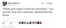 Hyleys “Tweets” were no more racist than the tweet she was responding to. Yet for some reason the reaction is one sided. Hyley lost her job, her family has been threatened, and she has been constantly harassed. The person who originally posted the anti white statement has received 0 harassing tweets, 0 threats, and nobody knows if they have a job let alone their name.