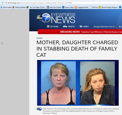 DuPage County, Illinois: Kelly Palermo and her daughter Samantha Palermo, have both been charged with felony animal cruelty.  Kelly apparently became angry with a family cat for an unknown reason. She then proceeded to hold the cat down while her daughter Samantha Stabbed it.  Kelly is 50, Samantha is 21.