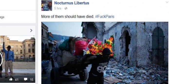Recently Nocturnus Libertus took to facebook to express her outrage that more people were not murdered in the horrible terrorist attacks in Paris. She posted the picture you see to the right (bottom if on cell phone) just 5 hours ago at the time of writing this article.