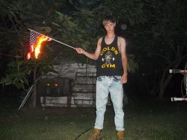 A picture has recently surfaced online of Dylann Roof burning an American flag. A website lastrhodesian.com was found by twitter users @HenryKrinkle and @EMQuangel. This website is reported to belong to Dylann Roof. It currently is offline. We located via internet archives an entire hidden cache of Dylann’s pictures which we’ll be releasing soon. This article covers the pictures of Roof Burning and stepping on an American flag.